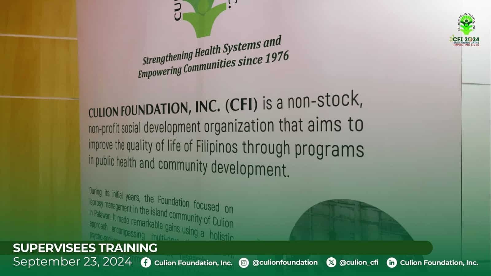 As of October 31, Culion Foundation, Inc. (CFI) has reached 168,801 beneficiaries across seven regions, from MIMAROPA to CARAGA, through the collective support of our donors, LGUs, communities, other non-government organizations, and national government partners....