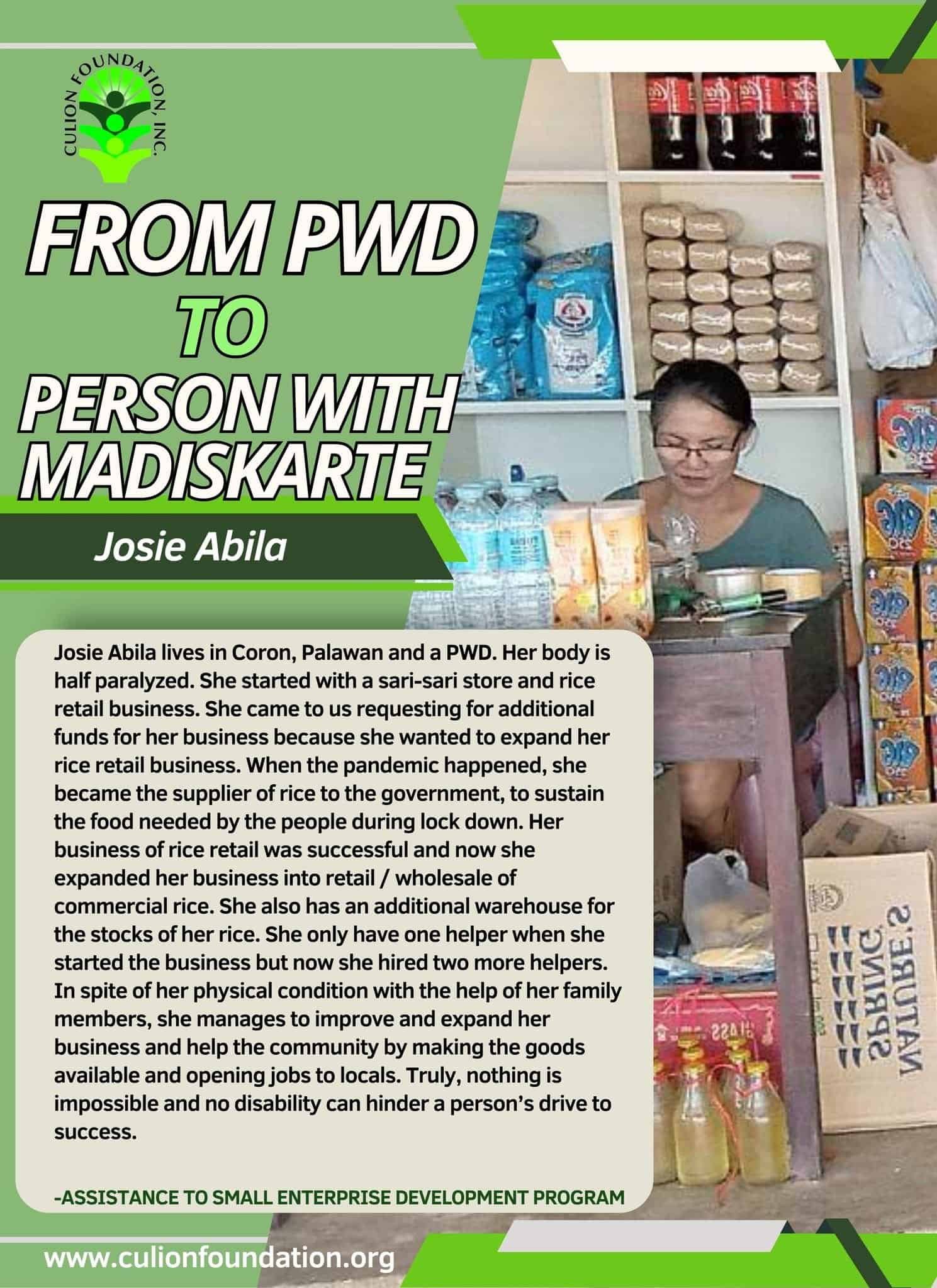 Here is the inspiring story of Ms. Josie Abila, a PWD and a client of CFIโs Assistance To Small Enterprise Development Project (ASEDP). ASEDP’s goal to assist communities in Culion and Coron, Palawan, in obtaining a sustainable livelihood, create an enabling environment that would make it possible for small business enterprises to have access to credit, and provide the community with convenient access to necessities on a daily basis.